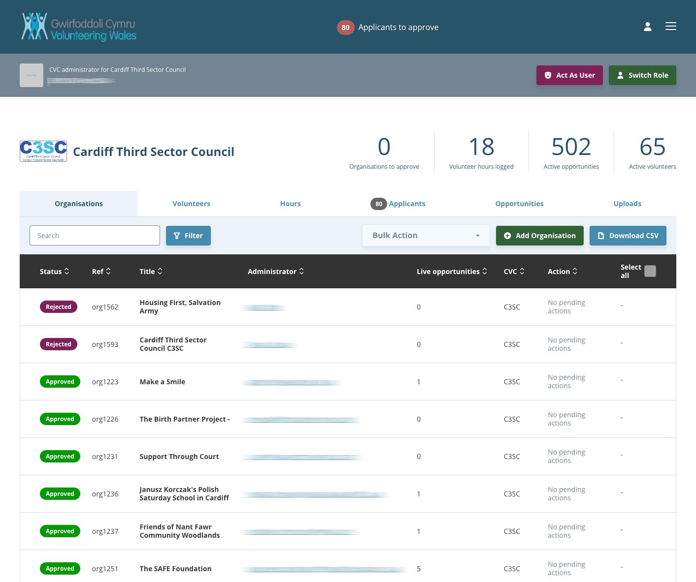 Within the admin platform there are multiple different views depending on who you are. Organisations can register, get approved and then start posting volunteering opportunities. Catering for the national network of County Voluntary Councils (CVCs) means that we give these users the admin rights to be able to run approvals and administer every aspect of the hub, and also manage their own volunteer centres and emergency events. Admins on both a local and national level can perform complex tasks and even act as different users to help out.